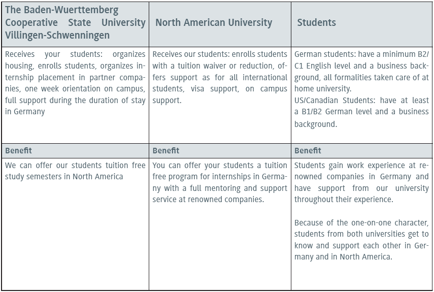 As internationalization is one of the main pillars for our successful study model, we would like to cooperate with North American Universities. Our students strive to study abroad, and one of their favorite continents has always been North America. We look to cooperate with universities seeking an internship exchange for their students and are willing to offer ours tuition waivers or reductions. A waiver of the tuition fees for our students going to your university in exchange for our free of cost Internship Program for your students on a one-on-one rate is what we are striving for. For each of our students at your university, you send one of your students to us for an internship in our student’s training company. Your student receive full support from us, free of costs.