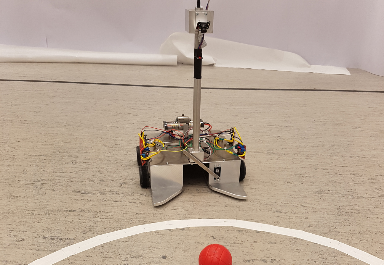 Studierende der Wirtschaftsinformatik und des Technical Managements haben in einem gemeinsamen, interdisziplinären Projekt autonome Roboter konstruiert. Die Roboter sollten in einem 50 Quadratmeter großen Feld selbstständig drei farbige Bälle finden, einsammeln und innerhalb von fünf Minuten in den weniger als einen Quadratmeter großen Zielkreis transportieren.