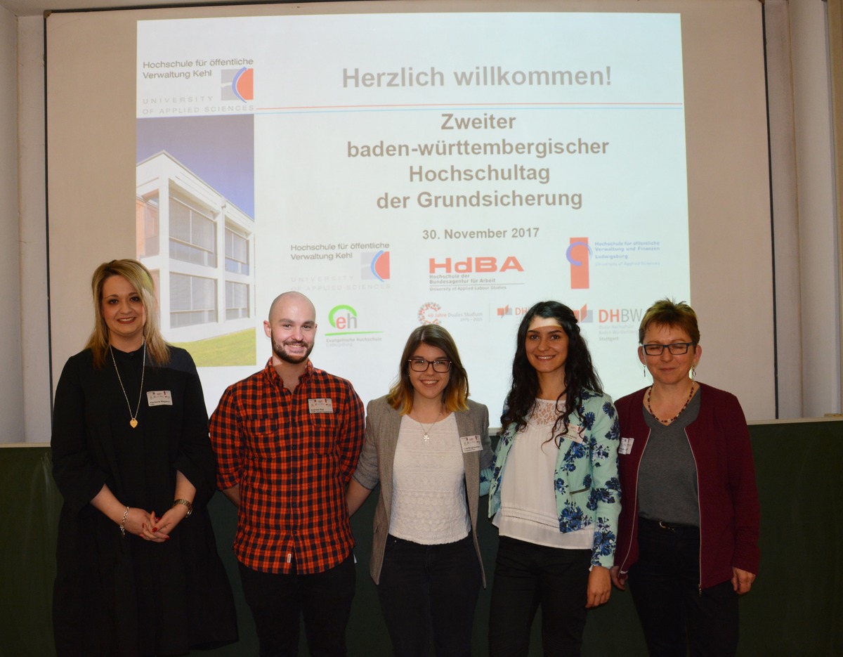 Bereits zum zweiten Mal fand am 30.11. der baden-württembergische Hochschultag zur Grundsicherung von Langzeitarbeitslosen nach dem Sozialgesetzbuch II an der Hochschule für öffentliche Verwaltung in Kehl statt. Diese Fachveranstaltung wurde wiederum gemeinsam von den Hochschulen in Baden-Württemberg gestaltet, die einen großen Teil der Mitarbeiterschaft der Jobcenter ausbilden: Duale Hochschule Villingen-Schwenningen und Stuttgart, Hochschulen für öffentliche Verwaltung Kehl und Ludwigsburg, Hochschule der Bundesagentur für Arbeit Mannheim, Evangelische Hochschule Ludwigsburg. Studierende, Absolventen und Professoren diskutierten über die Situation von Langzeitarbeitslosen sowie deren professionelle Beratung und Betreuung. In einem vielfältigen Programm wurden aktuelle Fragen der Grundsicherung für Arbeitsuchende diskutiert und ein Schlaglicht auf die Bedeutung der verschiedenen Studiengänge geworfen, die zur Tätigkeit in den Jobcentern hinführen. Dieser zweite Hochschultag zur Grundsicherung sollte darüber hinaus Praktiker aus den Jobcentern und Studierende zusammenbringen. Nach Prof. Dr. Matthias Brungs, Leiter des Studiengangs Bildung und Beruf, und Mit-Initiator dieser innovativen Veranstaltung war auch dieser zweite Fachtag ein großer Erfolg. „Studierende der unterschiedlichen Fachrichtungen, die in den Jobcentern später in einem Team zusammenarbeiten, haben ihre ausbildungsbedingt unterschiedlichen Sichtweisen im Beratungs- und Betreuungsprozess von langzeitarbeitslosen Menschen ausgetauscht und damit die eigene fachliche Perspektive erweitert. Für eine spätere Kooperation ist das Verständnis der Kollegen aus anderen Berufsgruppen entscheidend. Diese in 2-jährigem Abstand stattfindende Tagung ist daher eine wichtige Ergänzung zu den erlernten Studieninhalten der Teilnehmenden. Sie trägt dazu bei, die eigene Professionalität zu erhöhen und die Arbeit im Team zu fördern, sie kommt daher letztendlich den Klienten zugute.“